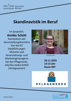 Im Rahmen der Vortragsreihe Im Gespräch berichten Absolventen und Absolventinnen der Skandinavistik (und anderer Geisteswissenschaften) von ihrem Berufsalltag, schildern Berufsbilder, Werdegang, Ideenentwicklung, Soft-Skills usw. und beantworten Fragen der Studierenden. In Workshops werden darüber hinaus berufspraktische Kompetenzen ganz konkret vermittelt und erprobt.