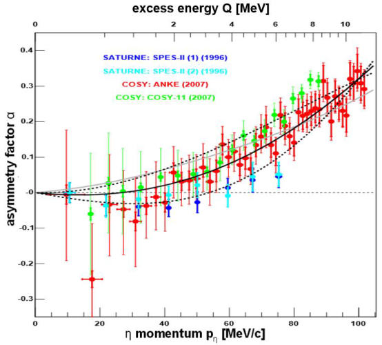 Darüberhinaus zeigen Analysen der differentiellen Wirkungsquerschnitte eine deutliche Winkelasymmetrie α, die auf eine rapide Veränderung der relativen Phase der beteiligten Partialwellen schließen lässt. All diese Effekte sind Indikatoren für eine unerwartet starke Endzustandswechselwirkung zwischen η-Mesonen und ³He-Kernen und somit auch auf einen quasi gebundenen Zustand des ³Heη-Systems.