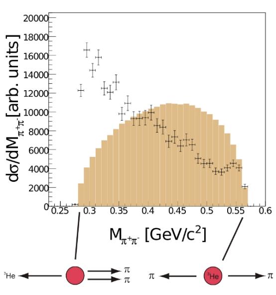 Abgesehen von Messungen mit η-Mesonen liefern auch Reaktionen, in denen Pionen beteiligt sind, vielfältige Erkenntnisse. So werden bei Nukleon-Nukleon-Streuprozessen, in denen zwei Pionen produziert werden, unter bestimmten Umständen deutliche Abweichungen vom nach Phasenraumrechnungen erwarteten Verhalten beobachtet. Dies äußert sich am deutlichsten in der Verteilung der invarianten Massen des ππ-Systems. Wie im unten dargestellten Bild für die Reaktion d + p -> 3He + π+ + π- zu erkennen ist, zeigt sich für geringe invariante Massen, die gleichbedeutend mit einem geringen Relativimpuls der Teilchen sind, ein deutlicher Überschuss gegenüber der nach rein kinematischen Gesichtspunkten erwarteten Verteilung.