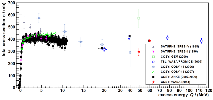 An ANKE wurde diese Reaktion unter Ausnutzung der sogenannten Spectatorkinematik erforscht. Hierbei stößt ein Protonstrahl mit dem Neutron im Targetdeuteron. Das verbleibende Proton wird als Spectatorteilchen betrachtet und seine kinetische Energie, die ein Maß für den Fermi-Impuls zum Zeitpunkt der Interaktion darstellt, kann mit einem speziellen Detektor gemessen werden. Aufgrund der (bekannten) Verteilung des Fermi-Impulses erlaubt dies die Messung der Wirkungsquerschnitte über einen großen Bereich der Überschussenergie mit einer einzigen Strahlenergie.