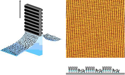 Template directed self-assembly of nanomaterials and molecular complexes into functional systems can be realized by using heterogeneous patterned surfaces. The heterogeneous surface structures may be composed of different materials, different tailored molecules, but can also be composed of single component but with different molecular packing. We are on one side working on the heterogeneous surface functionalization by means of LB patterning, soft lithography and photo/e-beam lithography techniques; on the other side, we are interested in the mechanisms of molecular interactions - from liquid phase and gas phase - with pre-structured surfaces. We are particularly interested in the nucleation control through the pre-designed patterns and the surface modification with organic films, which provide the possibilities to control the growth of organic conductive/semiconductive materials thus improve their charge transport behaviors.