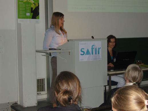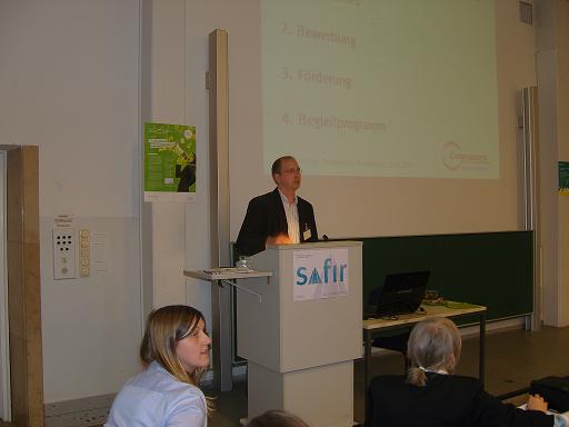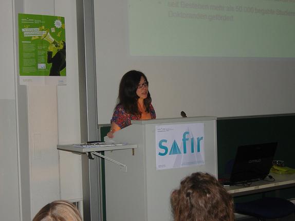 Frau Susanne Hefti M.A., Abteilungsleiterin der SAFIR-Antragsberatung (Abteilung 6.1 der WWU Münster), informierte über die vielfältigen Informations- und Beratungsangebote für Studierende, Promovierende und Wissenschaftlerinnen und Wissenschaftler der WWU Münster. Die Angebote reichen von der konkreten Antragsberatung in sämtlichen Bundes- und Landesprogrammen über die DFG und Stiftungen bis hin zu Informationen über Promotionsförderung und Stipendien, [ohne Abschluss-] Finanzierungsmöglichkeiten für wissenschaftlich motivierte Reisen oder Kongresse, Workshops zur Antragsformulierung und regelmäßige Newsletter.