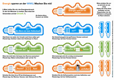 Mit der gestarteten Aufkleberaktion setzt der Arbeitskreis WWUmwelt ein weiteres Projekt aus dem Ideenwettbewerb "Wir setzen die Uni auf Sparflamme" um. Der Vorschlag erreichte bei dem Wettbewerb, der vom Arbeitskreis WWUmwelt zusammen mit der LBS und der Stadt Münster organisiert wurde, einen Spitzenplatz und bildet die zweite umgesetze Maßnahme. Bereits im Mai 2007 wurde im Foyer des Schlosses eine Energiesparuhr installiert, die den aktuellen Stromverbrauch der WWU anzeigt und zudem auf einem Monitor wichtige Hinweise zum Energiesparen gibt.