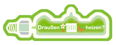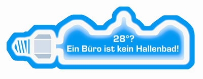 Energiesparen. Aufkleber mit Slogangs wie "28°? Ein Büro ist kein