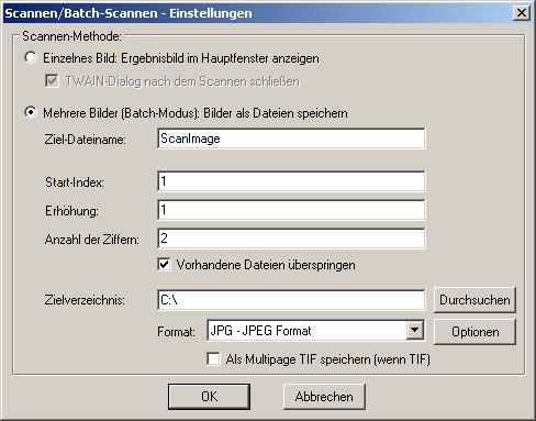 Nun wählen Sie 'Acquire/Batch scanning' bzw. bei aktivierter deutscher Sprache 'Scannen/Batch-Scannen' im File-, bzw. Datei-Menü aus. Wählen Sie in dem geöffneten Dialog 'Multiple images', bzw. 'Mehrere Bilder' aus.