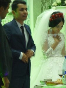 Um 19:30 Uhr ist es dann endlich soweit, die Halle hat sich gefüllt und zu einem Song, dessen Text uns mit „Braut kommt, Braut kommt“ übersetzt wird, zieht das Hochzeitspaar ein. Auf dem Weg nach vorn muss sich die Braut dabei alle paar Meter vor diversen Menschen verbeugen. Damit wir nicht völlig irritiert sind, wurde uns bereits vorab erklärt, dass die Braut am Hochzeitstag ob des Abschieds von ihrer Familie traditionell Demut zur Schau stellen muss. Dazu legt sie die rechte Hand aufs Herz und schlägt die Augen nieder. Mein Foto unten ist also ein absoluter Schnappschuss, auf dem die Braut ihre Neugierde auf die ausländischen Gäste ihres Mannes nicht verbergen kann. 🙂 Die restliche Zeit über steht das Paar aber tatsächlich ziemlich steif und nicht besonders glücklich dreinschauend vorne, wird von Gästen für Fotos belagert und kommt auch deshalb nicht zum Essen, weil die Speisen vor ihnen schnell unter Tausendsumscheinen begraben sind, während alle anderen beim ersten Lied direkt auf die Tanzfläche stürmen. Als wir uns nach einiger Zeit trauen, unseren Eindruck, dass auf der Hochzeit offenbar alle so richtig Spaß haben, nur das Brautpaar nicht, einer Usbekin mitzuteilen, grinst sie und bestätigt: „Das ist normal. Die eigene Hochzeit ist nie die Beste!“