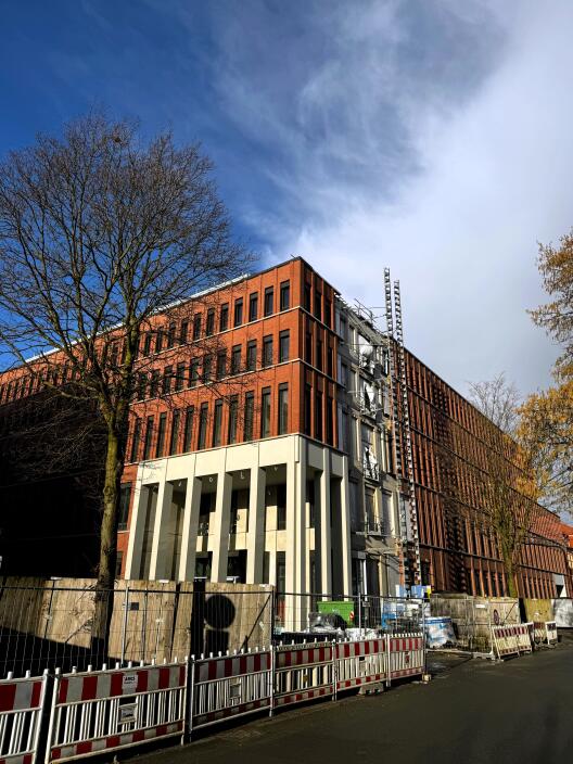 Zu Beginn des neuen Jahres ist die Verklinkerung des Neubaus für den Campus der Theologien nahezu abgeschlossen. Am benachbarten Neubau für die FH Münster wurde Anfang Februar bereits die Einrüstung vollständig entfernt, sodass die Fassade nun erstmals unverstellt sichtbar ist. Da die Fassadengestaltung beider Gebäude nahezu identisch ist, vermittelt der freigelegte Bau der FH Münster bereits einen Eindruck davon, wie auch der Neubau für den Campus der Theologien in wenigen Wochen aussehen wird.