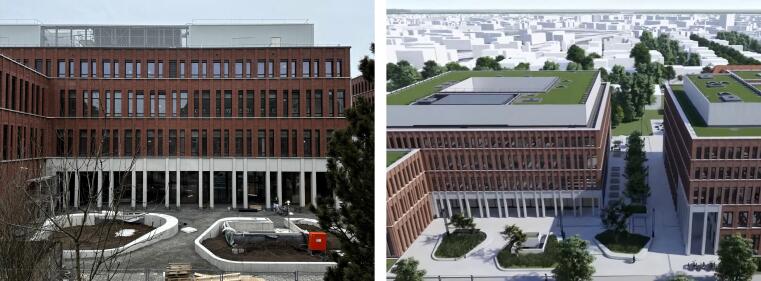Untenstehend ist links eine aktuelle Aufnahme des von der Robert-Koch-Straße aus zugänglichen Außenbereichs vor dem Neubau der Fachhochschule zu sehen, rechts ein Rendering dieses Bereichs. Im Rendering ist rechts der Theologie-Neubau mit seinem Haupteingang zu sehen.