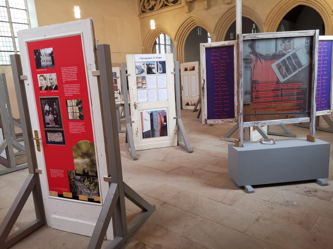 Die Ausstellung beinhaltet fünf zusammenstehende, beidseitig bedruckte Wände.