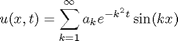 Now that we have the sine coefficients a_k of u0, we can solve the initial value problem by computing u(x,t) using the series above. Since explicit summation would be slow, we apply the fast inverse sine transform. So all we do is multiply the sine coefficients computed above with the degradation factors in the sum and take the inverse sine transform.
