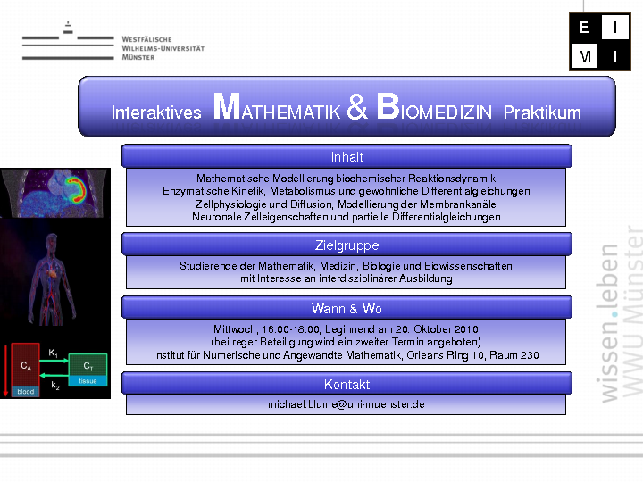 Durch die Kombination der Studierenden mit verschiedenem Hintergrund wird eine Adaption des bisherigen Ablaufs vorgenommen. Die erste Hälfte des Praktikums wird aus einem Einführungskurs und fachlicher Diskussion in Kleingruppen (unter Anleitung der Dozenten) bestehen, so dass eine gemeinsame Kommunikationsbasis geschaffen ist. In der zweiten Hälfte sollen dann konkrete praktische Aufgabenstellungen, die sowohl biomedizinische als auch mathematische Einsicht erfordern, in kleinen, möglichst heterogenen Gruppen bearbeitet werden. Der inhaltliche Fokus liegt dabei gezielt auf Aspekten der mathematischen Modellierung zellulären Physiologie, da hierzu bereits sehr enge Forschungskooperationen an der WWU etabliert sind.