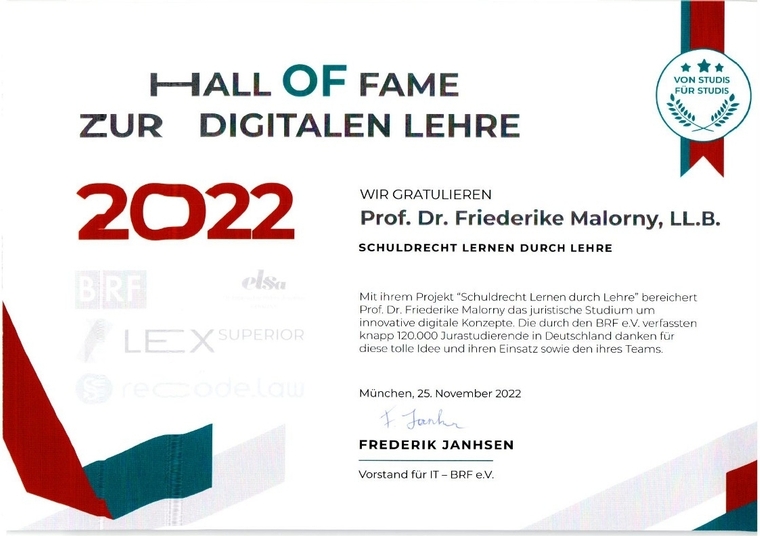 Von dem Bundesverband rechtswissenschaftlicher Fachschaften e.V. wurde eine Hall of Fame zur digitalen Lehre ins Leben gerufen, die das Projekt von Frau Prof. Malorny "Schuldrecht - Lernen durch Lehre" ausgezeichnet hat.