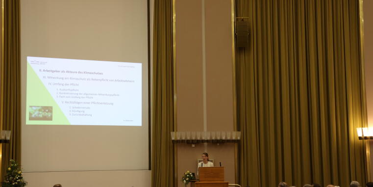 In ihrer dann folgenden Vorlesung zeigte Frau Prof. Dr. Wietfeld auf, dass der zur Eindämmung des Klimawandels erforderliche Klimaschutz auch Auswirkungen auf das Arbeitsrecht hat. Zunehmende Pflichten für Arbeitgeberinnen und Arbeitgeber, Klimaschutzvorgaben einzuhalten, sowie unternehmerische Entscheidungen, die Unternehmenspolitik nachhaltig auszurichten, können den Kanon der Pflichten im Arbeitsverhältnis verändern. Wenn der Gesetzgeber Private einsetzt, um Klimaschutzziele zu erreichen, kann sich diese Entscheidung im Verhältnis zu Arbeitsvertragspartnern dieser Privaten auswirken. Das arbeitsvertragliche Pflichtengefüge wandelt sich durch die Veränderungen, die politische und gesellschaftliche Reaktionen auf den Klimawandel hervorrufen. Können Arbeitgeberinnen und Arbeitgeber Klimaschutzziele nicht ohne Mitwirkung ihrer Arbeitnehmerinnen und Arbeitnehmer erreichen, trifft diese eine Pflicht, die Klimaschutzmaßnahmen durch ihre Mitwirkung zu unterstützen. Die Forschungsergebnisse, die Frau Prof. Wietfeld in ihrer Vorlesung präsentiert hat, werden im Jahr 2026 veröffentlicht.