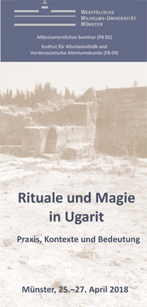 Prof. Dr. Reinhard Müller und Prof. Dr. Hans Neumann laden herzlich zum IV. Internationalen Ugarit-Kolloquium „Rituale und Magie in Ugarit. Praxis, Kontexte und Bedeutung“, ein, das vom 25.–27. April 2018 in Münster stattfinden wird. Das Kolloquium wird durch das Alttestamentliche Seminar der Evangelisch-Theologischen Fakultät der Westfälischen Wilhelms-Universität Münster und das Institut für Altorientalistik und Vorderasiatische Archäologie in Kooperation organisiert.