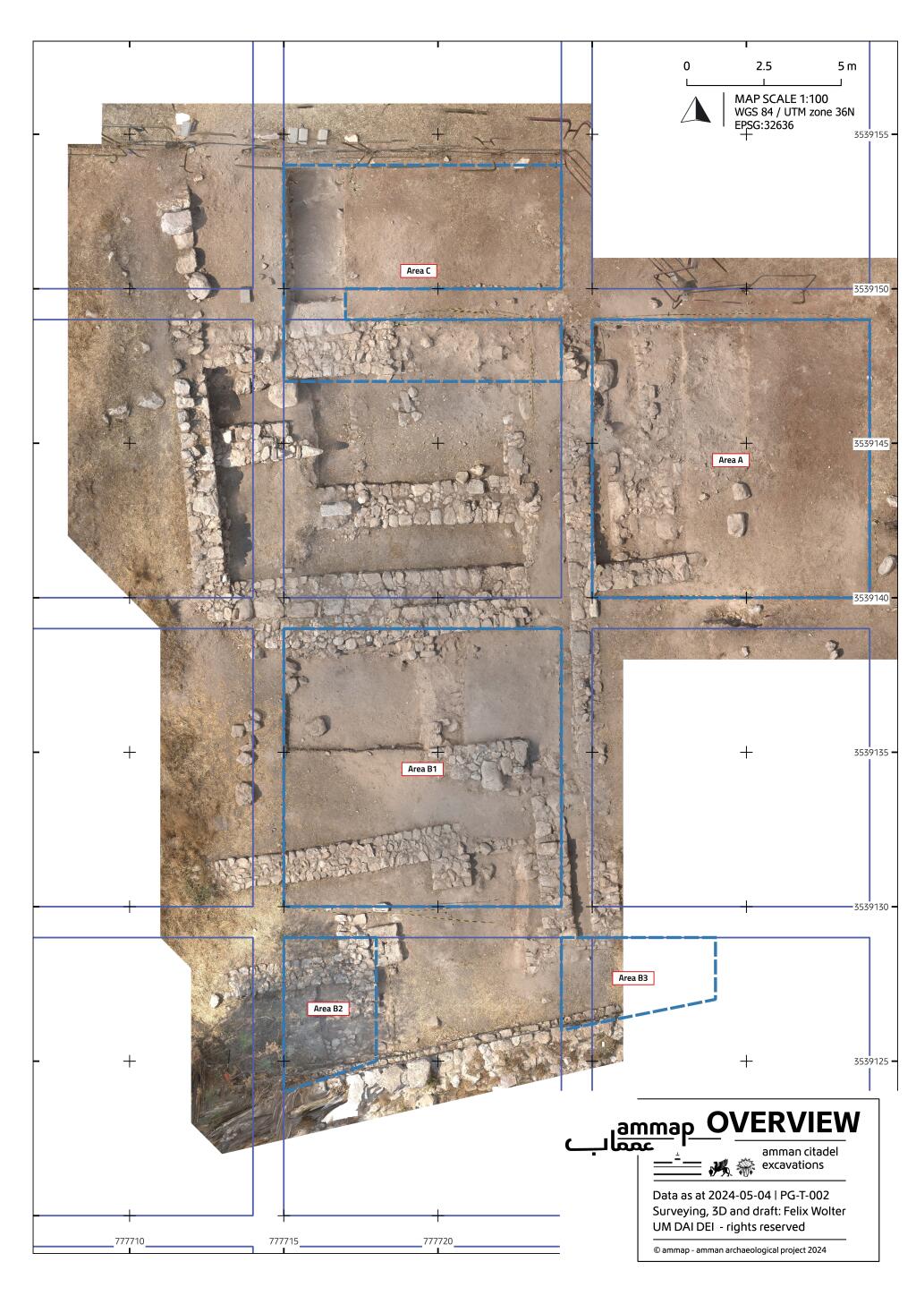 Overview of the amman citadel excavation areas 2024 before the campaign© ammap The 2024 excavation season focused on expanding our understanding of the southern edge of the Citadel’s lower terrace. We selected the excavation site based on the previous research and completed it by an architectural study with photogrammetry and structural analysis in the easternmost terrace. This research aimed to document previously uncovered structures in new detail.