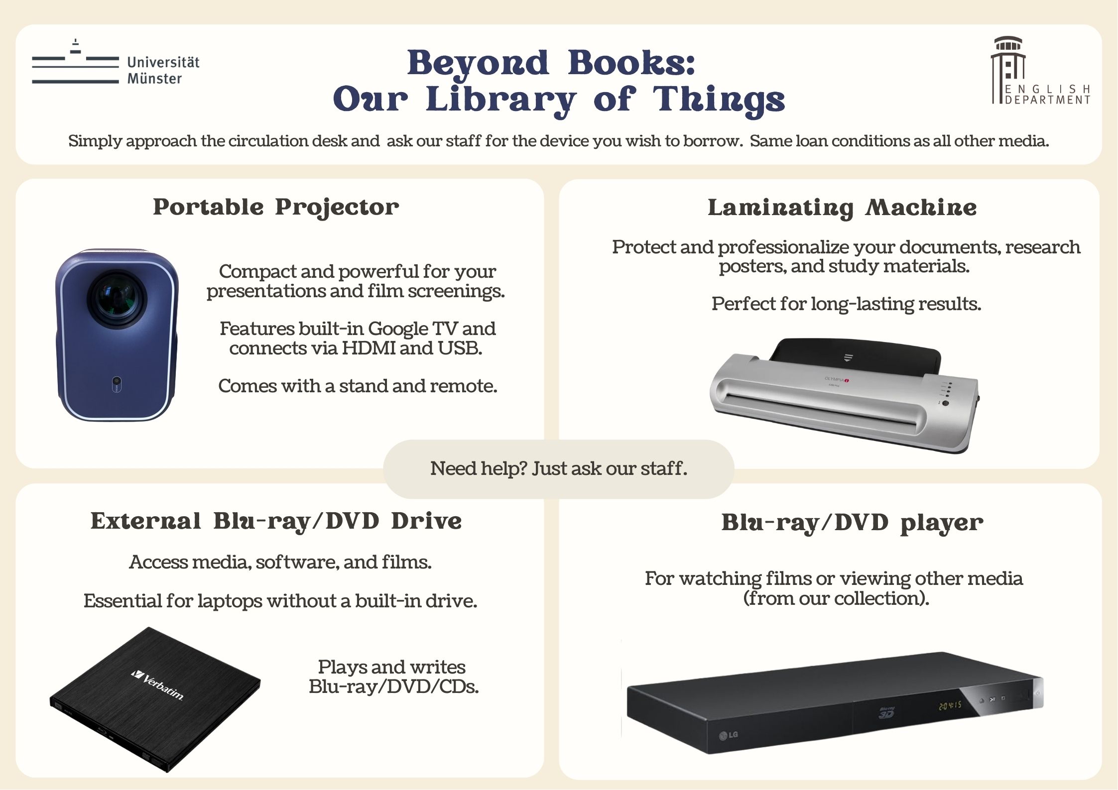 Portable projectors, a laminating machine, an external Blu-ray/DVD drive and a Blu-ray/DVD player are available to borrow from the English Department Library front desk. The loan conditions are the same as for all other media. Need help? Just ask at the front desk!