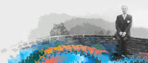 The image shows Huxley sitting on the wall near his California home in the Hollywood hills in 1959. The original photo, by Rose Nys, included Laura Huxley reclining on a chair, but the image was edited so that the bricks could extend to the left and become progressively less substantial. We can see Huxley lightly seated on the bricks. Considering his reference, above, to the bricks being like books on a shelf, he seems very comfortable there. One can imagine his love of books and his appreciation of the cloudy greyness of an ambiguous reality. The wall suggests the impermanence of objects like books; the colored psychedelic fog (a collage of mathematically derived Mandelbrot fractals) represents Huxley’s dual interest in hallucinogenic drugs and science. The bricks and fog show two of Huxley’s learning strategies: the use of the encyclopedias for hard facts and the use of mystical or chemical methods for subjective truths.