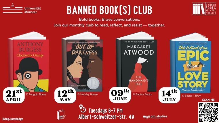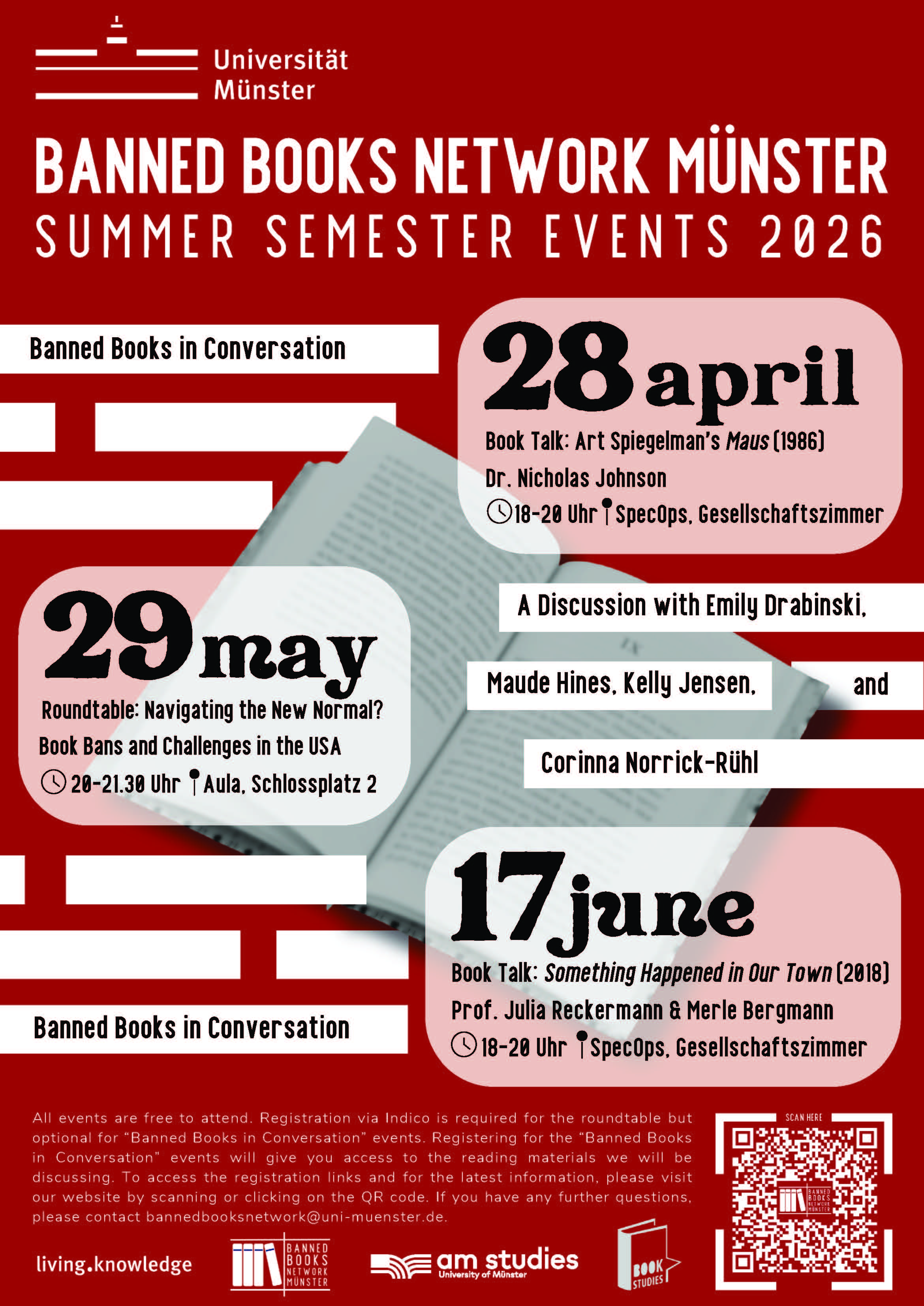 In response to the steep increase in book banning and (attempted) censorship in the USA and beyond, the University of Münster’s Chairs for Book Studies (Prof. Dr. Norrick-Rühl) and American Studies (Prof. Dr. Schultermandl) have founded a “Banned Books Network Münster” (BBNM). Two postdoctoral researchers at the Chair of American Studies, Dr. Jennifer Gouck (2025 WiRe fellow) and Dr. Sarah Pyke, are co-founders of this initiative. Our purpose is to raise awareness of the increase in book banning, and to create space for engagement with banned books and the wider repercussions of these bans. Our events are inclusive in nature, and we hope to engage students, teachers, colleagues and the wider reading public with our initiative.