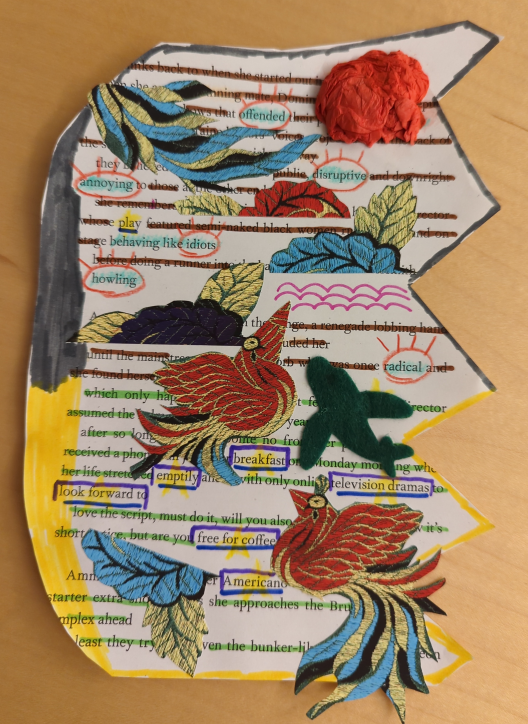 “Erasure poetry, also known as blackout poetry, is a form of found poetry wherein a poet takes an existing text and erases, blacks out, or otherwise obscures a large portion of the text, creating a wholly new work from what remains” (Academy of American Poets). Similar to how a palimpsest shows evidence of multiple layers of use, erasure poetry differs in that poets intentionally use erasure to bring texts into conversation. For this workshop, students were inspired by the theme of Satura volume 7: Deformed.