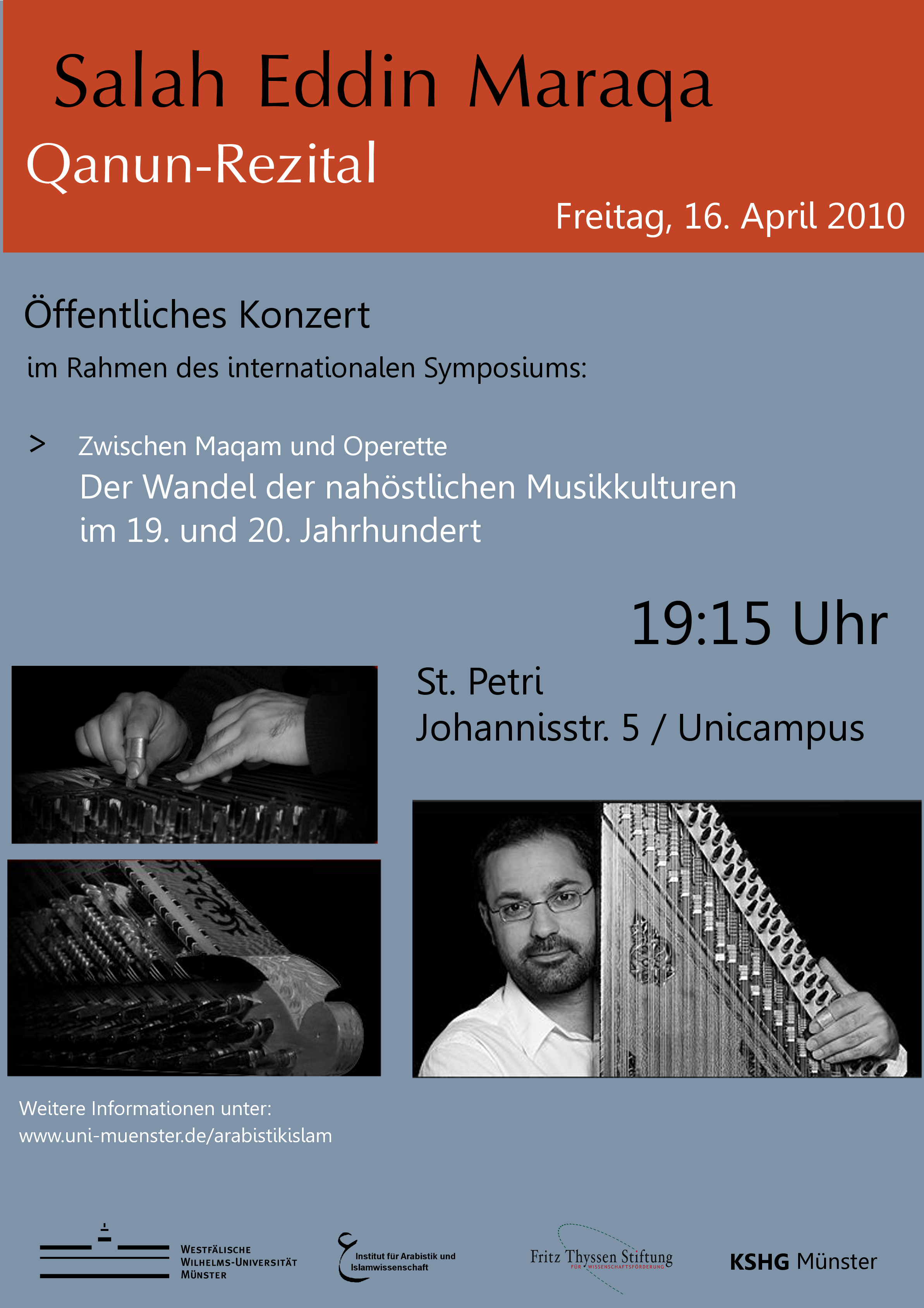 Im Rahmen des Symposiums findet auch ein öffentliches Konzert statt. Salah Eddin Maraqa spielt am Freitag um 19:15 Uhr Qanun. Das Plakat zum Konzert finden Sie hier. Das Programm des Symposiums finden Sie hier, ein Plakat hier.