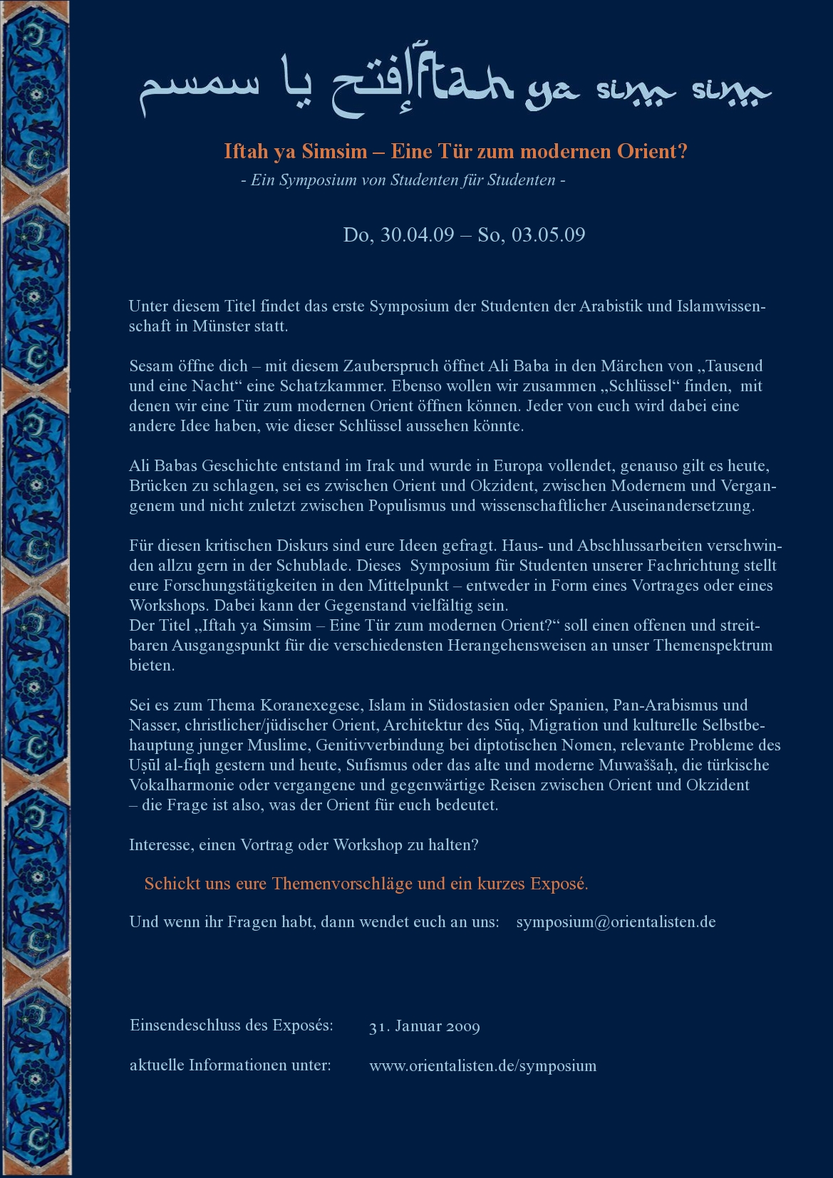 Ab dem 29.5. bietet Herr Omar donnerstags von 12-14 Uhr ein Proseminar zum Thema "Sprichwörter und Redensarten im Arabischen unter besonderer Berücksichtigung des ägyptisch-arabischen Sprachraums" an. Interessenten mögen sich bitte bei arabist@uni-muenster.de oder im Institut anmelden (Listen hängen aus). Bei Bedarf kann das Seminar auch als Blockveranstaltung stattfinden.