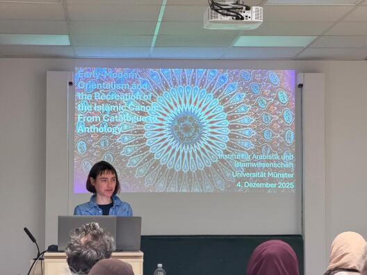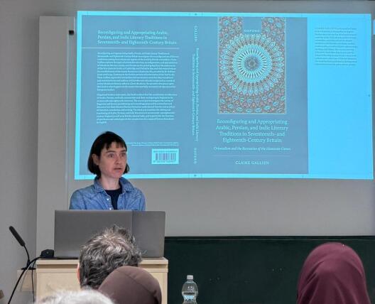 Zum zweiten Vortrag der Wintervorlesungsreihe 2025/26 durfte das Institut für Arabistik und Islamwissenschaft Dr. phil. habil. Claire Gallien (Cambridge) begrüßen, die derzeit als Gastwissenschaftlerin am Institut weilt. In ihrem Vortrag bot sie Einblicke in ihre jüngst erschienene Monografie Reconfiguring and Appropriating Arabic, Persian, and Indic Literary Traditions in Seventeenth- and Eighteenth-Century Britain. Orientalism and the Recreation of the Islamicate Canon. Darin untersucht sie, wie arabische, persische und indische Literaturtraditionen in Großbritannien im 17. und 18. Jahrhundert ausgewählt, rekonfiguriert und angeeignet wurden.