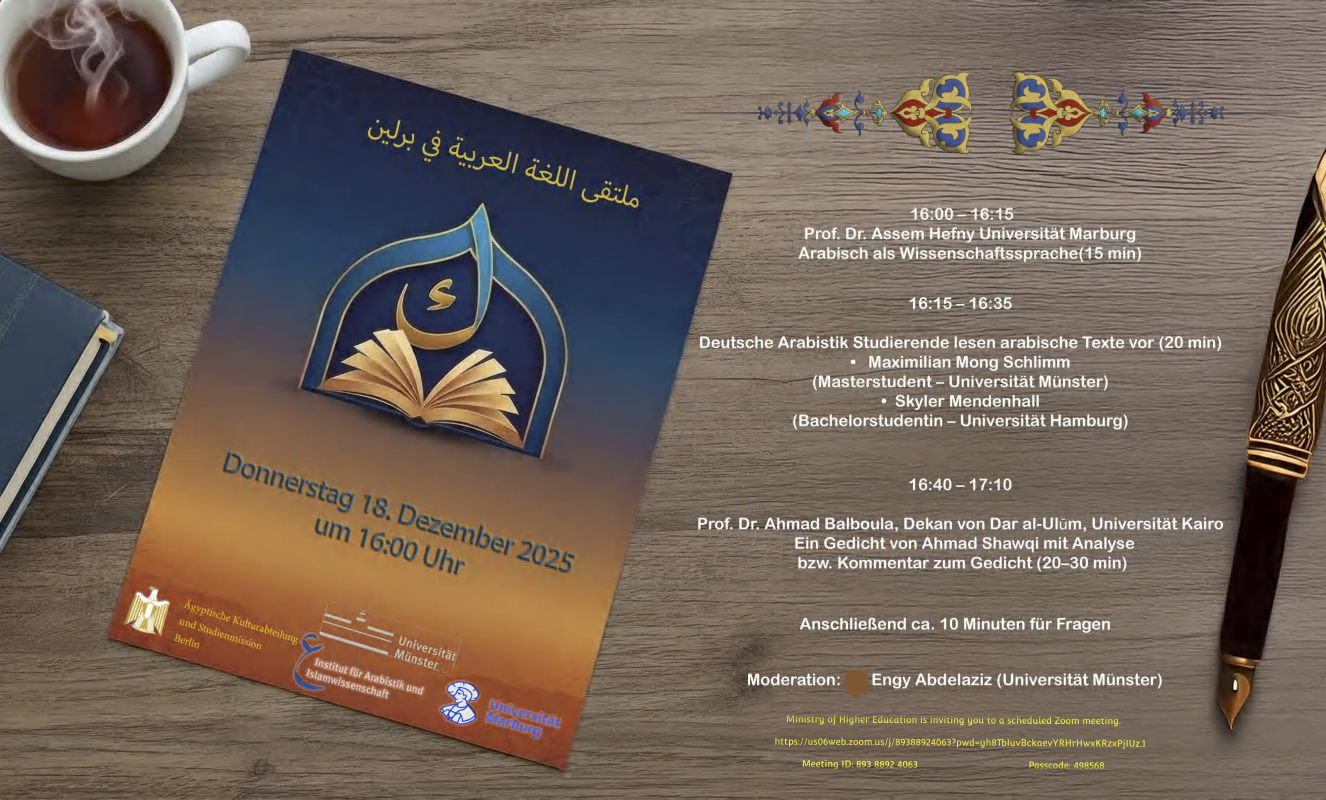 Anlässlich des Welttags der arabischen Sprache veranstaltet die Kulturabteilung und Studienmission der ägyptischen Botschaft in Berlin in Zusammenarbeit mit dem Institut für Arabistik der Universität Münster und der Philipps-Universität Marburg am 18.12. eine Feier zur Würdigung der Bedeutung von Arabisch als Sprache in Wissenschaft, Kultur und internationalem Dialog.