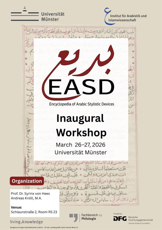 Am 26. und 27. März 2026 findet am Institut für Arabistik und Islamwissenschaft der Auftaktworkshop des DFG-Projekts Encyclopedia of Arabic Stylistic Devices (EASD) statt.