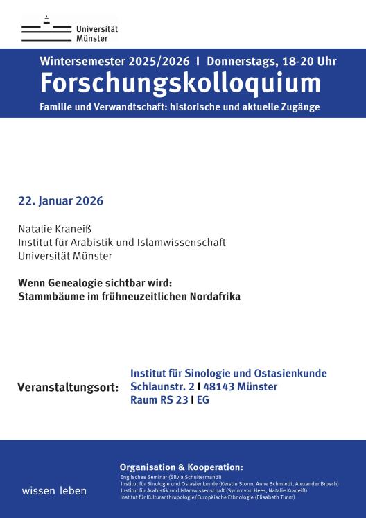 Im Rahmen des Forschungskolloquiums "Familie und Verwandtschaft" wird Natalie Kraneiß am Donnerstag, den 22. Januar 2026 einen Vortrag über die visuelle Darstellung von Abstammung in Form von Stammbäumen im Marokko des 17. und 18. Jahrhunderts halten.