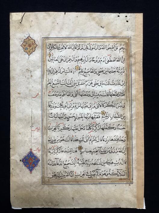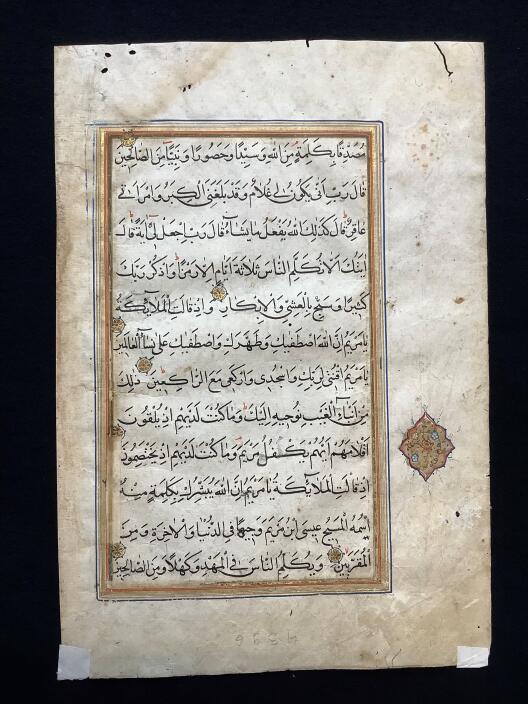Inventarnummer: Hs. 31 Datierung: 18. oder 19. Jahrhundert Geographischer Bezug: Osmanisches Reich/ Türkei Material: Papier Umfang: Ein Folio, 12 Zeilen Maße: 20,5 x 30 cm, Rahmen des Schriftspiegels 14 x 22,5 cm Duktus: Nasḫ Illumination: recto eine goldgrundige Khamsa und eine blaugrundige ᶜAshara in Rautenform mit filigranen Blumen zur Markierung von 5 bzw 10 Versen , verso eine Khamsa Textstelle: Sure 3 Āl ᶜImrān: recto 3:31-39, verso 3:39-46 Provenienz: 2025 aus dem Nachlass von Dr. Niels Kranemann Münster, (st. 2025), erhalten, dem das Blatt um 1990 in der Türkei geschenkt worden war