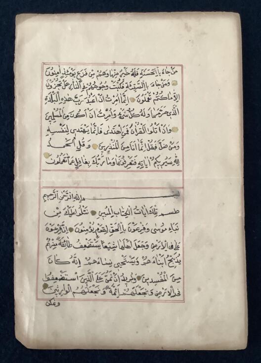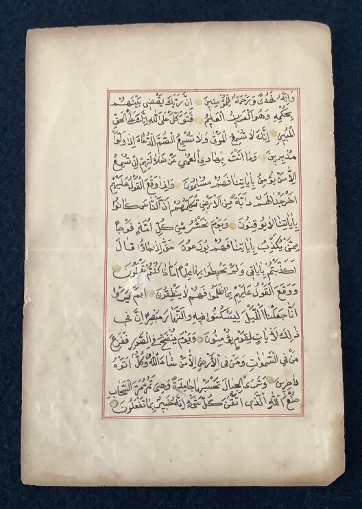Über die Gründe, warum das Blatt nicht vollendet und vermutlich nie in einen Muṣḥaf (ein physisches Koranexemplar) eingebunden wurde, lässt sich nur spekulieren: Möglicherweise wurde es von einem noch unerfahrenen Schreiber angefertigt und aufgrund seiner geringen Qualität nicht weiter illuminiert. Da das Blatt aber das als heilig geltende Gotteswort enthielt, durfte es nicht weggeworfen werden. Möglicherweise lagerte es über Jahrzehnte oder länger in einem Stapel von ungenutzten Koranblättern und geriet in Vergessenheit. Um 1990 erhielten unsere Stifterin und andere Mitglieder einer offiziellen NRW-Delegation von Pädagog*innen bei einem Besuch in der Türkei das vorliegende Blatt und weitere Blätter als Geschenk.