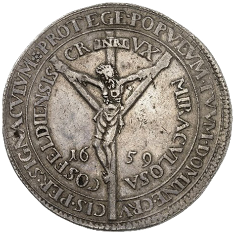 Das schmerzverzerrte Gesicht legt Zeugnis ab von der Brutalität des Todes, das Y-förmige Kreuz stellt besonders ausdrucksstark das Leiden Jesu Christi dar, dessen Arme durch die Gabelform weit nach oben gestreckt werden. Mit Maßen von 3,24 Meter Höhe und 1,94 Meter Breite ist das Gabelkreuz, das in der Kirche St. Lamberti in Coesfeld steht, das größte seiner Art in Deutschland. Ein bedeutender Verehrer des Coesfelder Kreuzes war der münstersche Fürstbischof Christoph Bernhard von Galen, der 1659 den Großen Kreuzweg als Prozessions- und Andachtsweg stiftete. Im selben Jahr ließ er Münzen prägen, die das Bild des Coesfelder Kreuzes tragen. Diese Gedenkprägung, von denen das Museum Abtei Lisborn im vergangenen Jahr ein Exemplar erwerben konnte, ist die Münze des Monats.