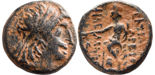 Auch wenn die Felsenstadt Petra das ursprüngliche Zentrum des nabatäischen Reiches war, so entstanden seine ersten Münzen in Damaskus. Die syrische Stadt war 84 vor Christus von König Aretas III. übernommen worden, der sie zu seiner Residenzstadt machte. Zum Zeichen des Erfolges und der sich langsam verfestigenden staatlichen Strukturen ließ Aretas insgesamt vier verschiedene Münztypen prägen, von denen eine Bronzemünze mit dem Bildnis der Tyche von Damaskus unsere "Münze des Monats" im Januar ist. Die nabatäischen Silber- und Bronzemünzen folgten dem phönizischen Gewichtsstandard. Ursache könnten die engen ökonomischen Beziehungen zwischen den Regionen gewesen sein.