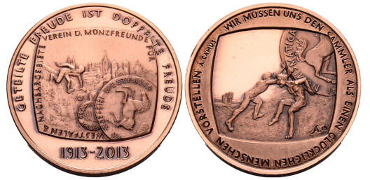 Vor 111 Jahren, am 31. März 1913, wurde in Hamm der "Verein westfälischer Münz- und Medaillenfreunde" gegründet, seit 1920 "Verein der Münzfreunde für Westfalen und Nachbargebiete". Vor elf Jahren konnte das hundertjährige Bestehen gefeiert werden. Für die Jubiläumsmedaille wurde für Entwurf und Modell eine schon mit mehreren Preisen für Prägemedaillen bedachte junge Künstlerin gewonnen: Anna Martha Napp, geboren 1982 als Tochter des Künstlerehepaares Hans W. Scheibner und der Malerin Karin Zimmermann. Sie studierte an der Kunsthochschule Burg Giebichenstein in Halle bei Professor Bernd Göbel und arbeitet selbständig in ihrem Heimatort Maßlow in Mecklenburg. Weitere Informationen finden Sie in unserer Rubrik "Münze des Monats".