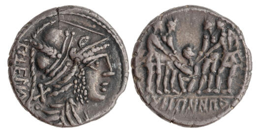 Auf den ersten Blick erscheint die Münze des Monats Juli wie ein gewöhnlicher römisch-republikanischer Denar, doch bei genauerer Betrachtung zeigt sich, dass die Legende offensichtlich nicht lateinisch ist. In Material, Größe, Gewicht und Erscheinungsbild gleicht die Münze römisch-republikanischen Denaren, doch stellt sie tatsächlich eine für lange Zeit letzte Kampfansage italischer Städte und Stämme an die (Münz-)Hoheit Roms dar. Die vielleicht im Rahmen eines Donativs oder einer Sonderemission geprägten Münzen - wahrscheinlich 90 bis 88 vor Christus - postulierten die Souveränität der Aufständischen gegenüber der (Münz-)Hoheit Roms im Bundesgenossenkrieg.