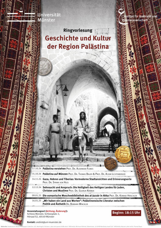 Um die Situation im heutigen Nahen Osten zu verstehen, ist ein Blick in die Geschichte unabdingbar. Den bietet die Ringvorlesung "Palästina verstehen", die das Institut für Arabistik und Islamwissenschaft organisiert. Sie startet am 17. Oktober mit einem Überblick von Prof. Alexander Flores, Professor (a.D.) für Wirtschaftsarabistik an der Hochschule Bremen. Prof. Achim Lichtenberger, Direktor des Archäologischen Museums, folgt am 31. Oktober gemeinsam mit Prof. Thomas Bauer, dem geschäftsfürhrenden Direktor des Instituts für Arabistik und Islamwissenschaft. Sie sprechen über "Palästina auf Münzen".