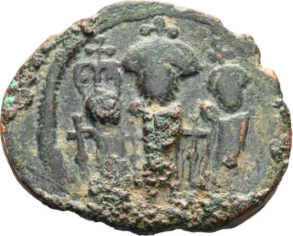 Unsere Münze des Monats erinnert mit dem Poträt Herakleions und seines Sohnes Constantin II., die beide einen Kreuzglobus in der Hand halten (links), an den Weltmachtanspruch eines Reiches, das nicht nur durch äußere Feinde, sondern auch durch wirtschaftluche Schwäche immer bedeutungsloser wurde.