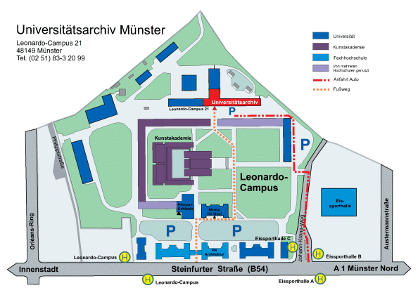 Ab Autobahnausfahrt Münster-Nord (A 1) Richtung Zentrum, am Ortseingang rechts (Johann-Krane-Weg), sofort wieder links (Leonardo-Campus), weiter siehe Lageplan.
