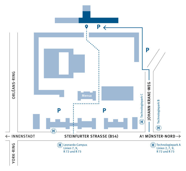Alternative: Linie 9 Richtung Kinderhaus v.-Humboldt-Straße oder Sprakel bis Haltestelle Leonardo-Campus, weiter siehe Lageplan.