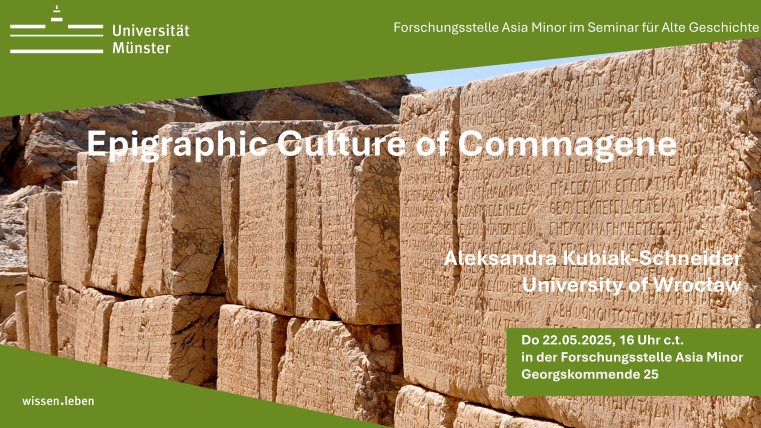 Am 22.05 um 16 Uhr c.t. spricht Aleksandra Kubiak-Schneider (University of Wrocław) in der Forschungsstelle Asia Minor zum Thema „Epigraphic Culture of Commagene“: