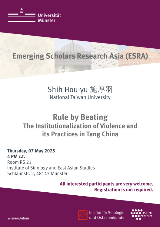 As part of the "Emerging Scholars Research Asia (ESRA)" lecture series, the Asian Studies Centre and the Institute of Sinology and East Asian Studies invite all interested parties to a lecture by Shih Hou-yu 施厚羽. On Thursday, 7 May 2026, 4 PM c.t., the visiting scholar from National Taiwan University will speak on the topic "Rule by Beating: The Institutionalisation of Violence and its Practices in Tang China". No registration is required.