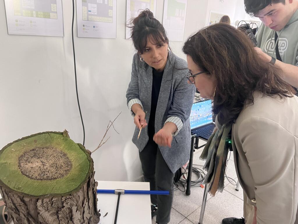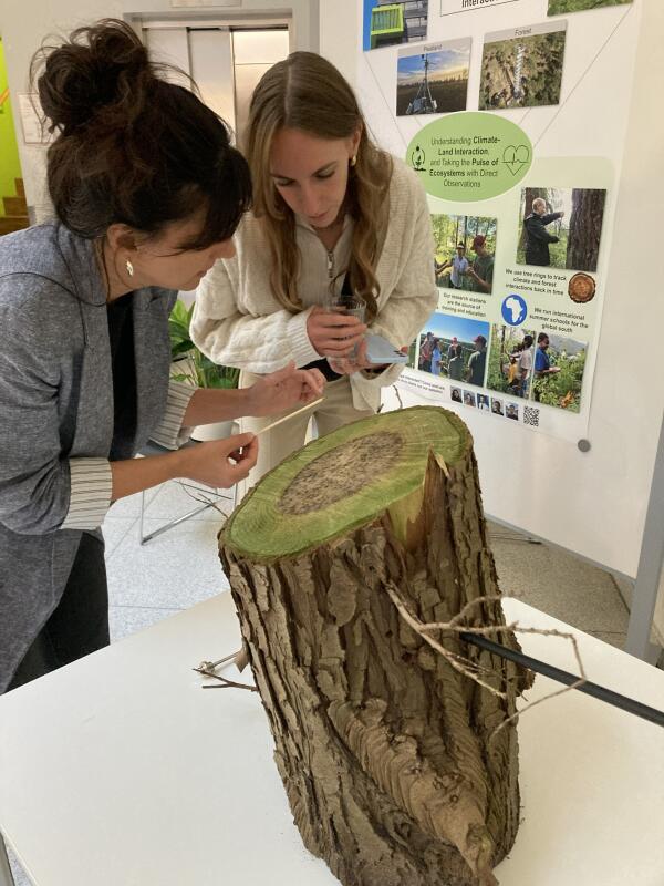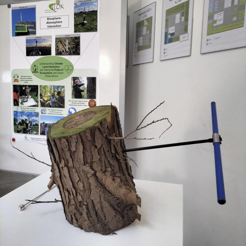 An einem Baumstamm konnten Besucher:innen Baumkerne mit einem Bohrer selbst entnehmen. Diese Methode gehört zum Bereich der Dendrochronologie, mit der man unter anderen das Alter von Bäumen bestimmen, aber auch Aussagen über vergangene Klimabedingungen treffen kann.
