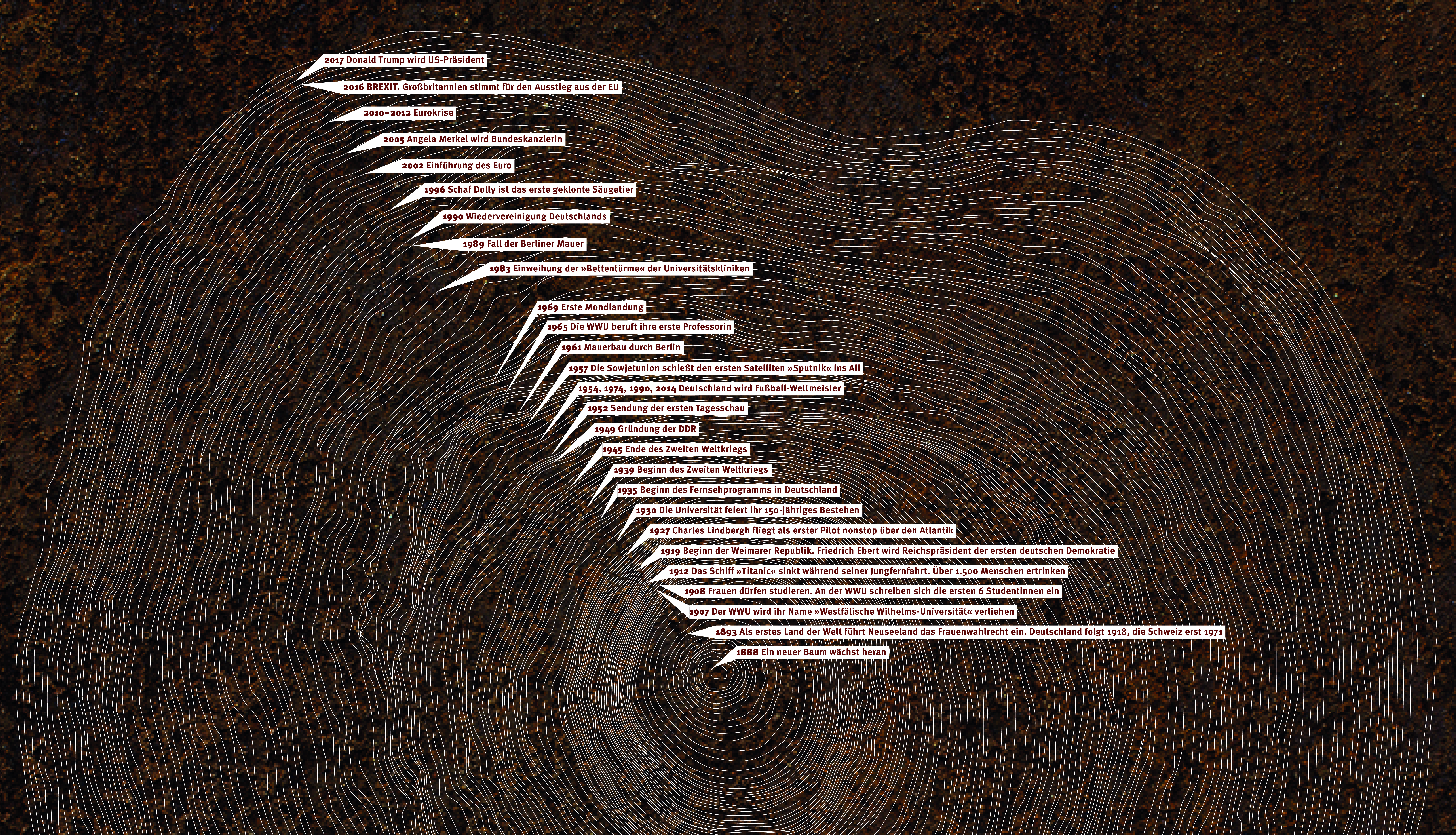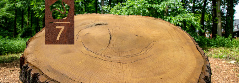 Am Stamm dieser Eiche könnt ihr beispielhaft sehen, dass jeder Baum ein Tagebuch über sein Leben führt. Wenn er wächst, entstehen immer neue Jahresringe: im Frühjahr ein heller und im Herbst ein dunklerer Ring. So kann man das Alter eines Baumes an seinen Jahresringen ablesen. Breite Ringe erzählen von guten Jahren mit viel Feuchtigkeit. Schmale erzählen von schlechten Jahren, in denen es zum Beispiel trocken oder kalt war. Diese Eiche wurde ca. 130 Jahre alt. Sie musste gefällt werden, weil sie im Alter morsch geworden war und umzustürzen drohte. Unser Baumkalender zeigt euch, welche historischen Ereignisse dieser Baum im Laufe seines Lebens erlebt hat. Ganz schön beeindruckend!