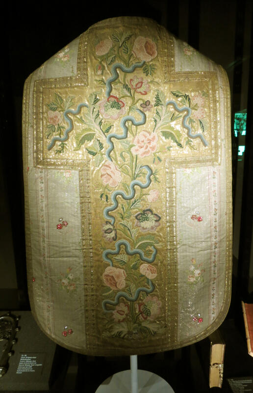 Kasel (Bischofsgewand) mit floralen Darstellungen auf dem Rückenteil. In Auftrag gegeben wurde sie von Kaiserin Maria Theresia von Österreich für ihren Sohn Maximilian Franz, Fürstbischof von Köln und Münster.© Bibelmuseum Münster