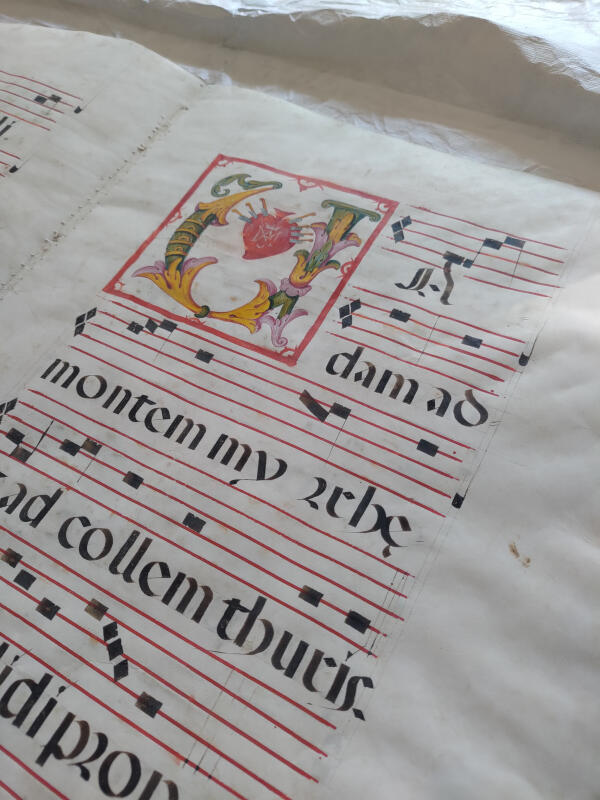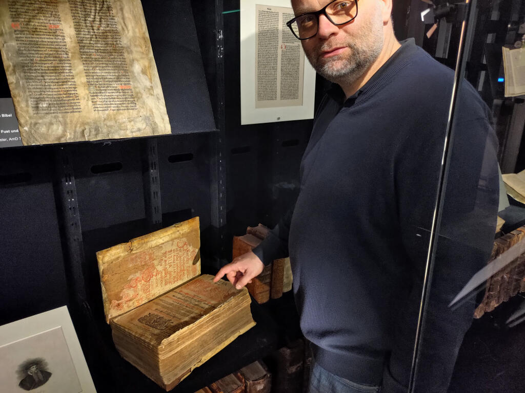 Wie verschiedene biblische Figuren und Ereignisse im Alten Testament auf das zentrale Geschehen des christlichen Glaubens hinweisen, zeigen Textstellen und Illustrationen aus historischen und modernen Bibeln. Erstmals zu sehen sind zwei Neuzugänge, die das Bibelmuseum erst vor kurzem erhalten hat: ein so genanntes "Antiphonar", eine Notensammlung von liturgischen Gesängen. Die großen Blätter boten genug Platz für die komplexen Notationen und kunstvollen Initialen. Gezeigt wird in der Ausstellung eine Initiale mit einer Darstellung der "Sieben Schmerzen Marias", die in der katholischen Kirche als Erinnerung an die tiefe Liebe und den Schmerz, den Maria als Mutter Jesu erlebt hat dienen.