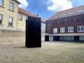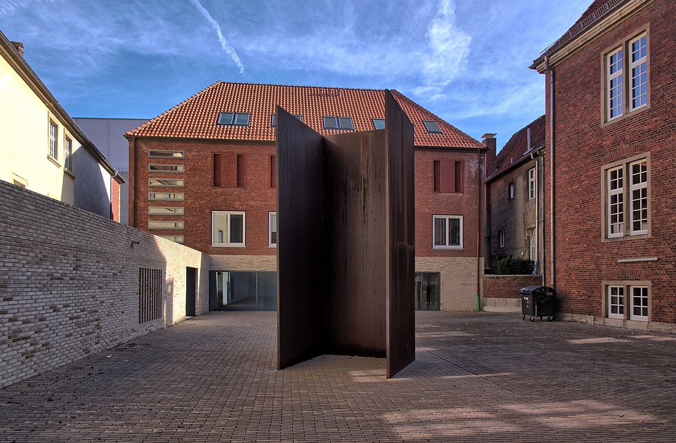 Wer vom Aegidiimarkt aus durch den Torbogen des Bibelmuseums tritt, sieht als erstes eine fünf Meter hohe, massive Stahlskulptur, die im von Backsteingebäuden umsäumten Innenhof wie ein Fremdkörper wirkt. Das 13 Tonnen schwere Werk des amerikanischen Bildhauers Richard Serra löst eine Irritation aus, die der Künstler bewusst hervorrufen wollte. Sein Anliegen war es, durch künstlerische Eingriffe Räume, Gebäude oder ganze öffentliche Plätze maßgeblich zu prägen. Ursprünglich hat Serra die Skulptur "Fassbinder I" nicht für die Pferdegasse, sondern für den Innenhof des gegenüberliegenden LWL-Museums geschaffen. Durch dessen Umbau musste ein neuer Standort gefunden werden, durch die Aufstellung im Hof des Bibelmuseums konnte ein Kompromiss gefunden werden, mit dem auch der Künstler einverstanden war.