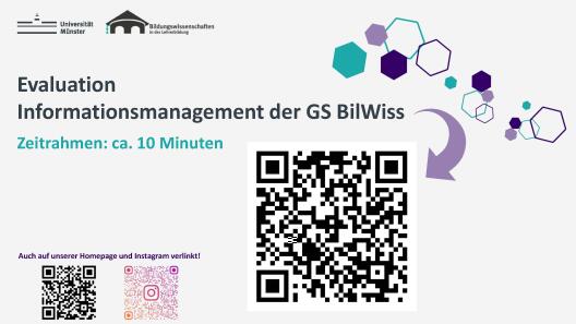 Deshalb laden wir Sie herzlich ein, an unserer Umfrage teilzunehmen (sofern Sie nicht bereits im Rahmen einer Ihrer bildungswissenschaftlichen Lehrveranstaltungen daran teilgenommen haben), in der Sie die Gelegenheit haben, das Informationsangebot der Geschäftsstelle Bildungswissenschaften zu bewerten und konstruktive Wünsche zu äußern. Durch Ihre Teilnahme können Sie aktiv an der Optimierung der Angebote für Studierende in den Bildungswissenschaften mitwirken.