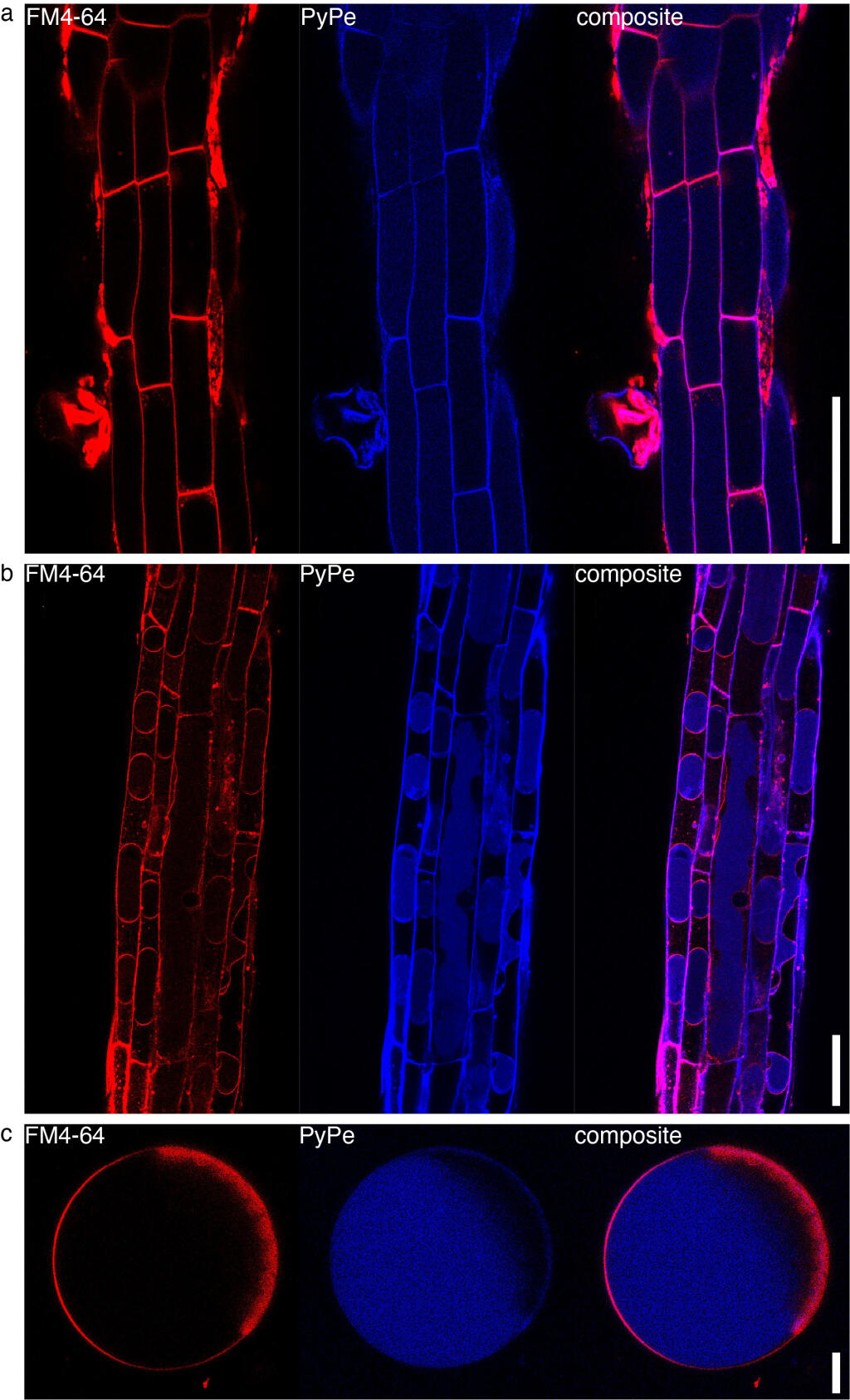 We could recently test a new fluorescent dye called PyPe developed by the colleagues from Chemistry Department (UniFR, CH). We could show that it has a low toxicity in plant cells. PyPe stains cell walls and penetrates cytoplasm, but is not labelling plasma membrane.
