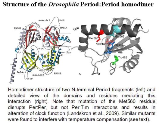 This is quite a remarkable feature, because (a) temperature cycles do influence the clock (see above), and (b) biochemical reactions usually occur at a faster rate at higher temperatures. Temperature compensation is even more remarkable when considering poikilotherm animals like Drosophila, who adjust their body temperature with that of the environment. Of course it is crucial that circadian clocks are temperature compensated, because a clock that runs with different speed at different temperatures would not be a clock (rather a thermometer). Despite this fascinating feature, the molecular mechanisms underlying temperature compensation are not understood in any system. In Drosophila several models have been put forward that implicate temperature-dependent inter- and intra-molecular interactions between key clock proteins as crucial part of this mechanism. Recently, we identified a region within the Period protein that disrupts temperature compensation when altered. Similarly, we could show that a different region of this clock protein is important for the formation of a Per:Per homodimer (Figure) and reveal its function within the circadian clock mechanism (Landskron et al., 2009). Following similar approaches, we are now determining the potential effects on protein:protein interactions mediated by the temperature compensation defective Per protein we identified. Our preliminary data lead to a hypothesis whereby temperature-dependent protein interactions between different clock proteins (e.g., Per and Tim) influence the rates of nuclear import and export of these proteins. Because the nuclear concentrations of Per and Tim influence the transcription rate of their own RNA, temperature-controlled nuclear-cytoplasmic shuttling could represent a basic principle of temperature compensation, at least in Drosophila.
