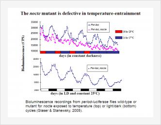 In nature, both the daily changes of light and dark and the concomitant changes in ambient temperature serve as signals to synchronize circadian clocks. In order to understand how these two pathways are integrated on a neuronal and molecular level we initiated studies using only temperature cycles as synchronizing factor (Glaser & Stanewsky, 2005).